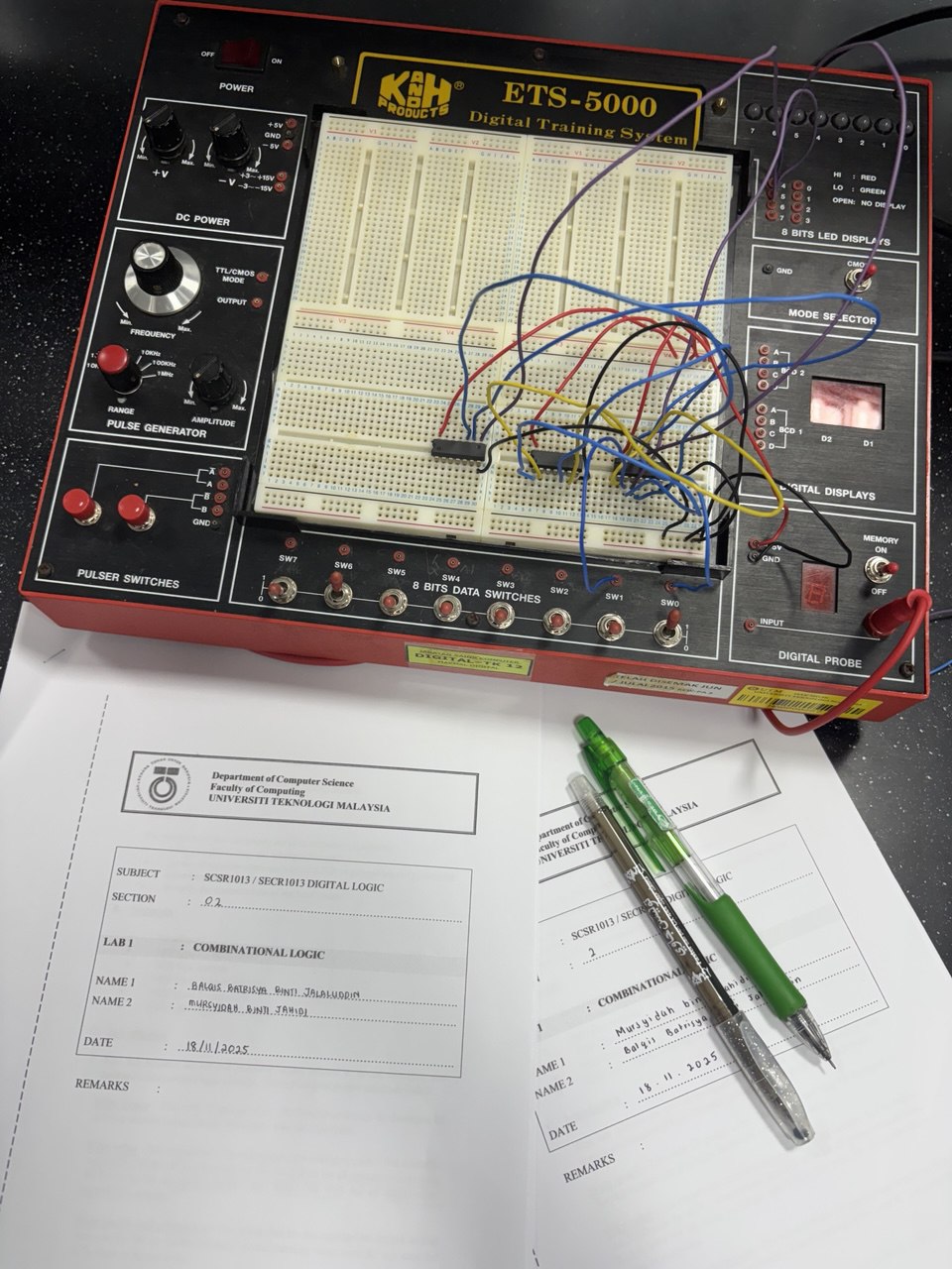 - Doing lab 1 was a really meaningful experience for me because it was the first time I actually building logic gates on real breadboard. I learned that staying organized is key, so I followed the color code by using red for all Vcc connections, black wire for all ground connections, blue wire for all input switches, and yellow wire for all intermediate signal connections, which helped me avoid confusion. I also learned how important IC orientation is, bacause placing the IC the wrong way could damage it. This made my partner and I to be more careful during the lab. The most interesting part of the lab was testing the circuit and observing the LEDs on the digital kit. Seeing the LED turn red for logic High (1) and green for logic Low (0) made it easier to check whether the circuit was working correctly according to the truth table. It felt really satisfying when we managed to get the correct result on the first try. Overall, realizing that a complex circuit made up of several gates could function the same as a single logic gate really helped me understand digital logic in a more practical way. I hope I can gain more hands on experience like this in future labs to improve my understanding fo what I learned in class.